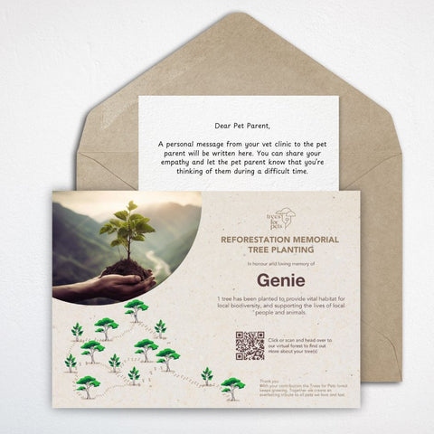 It means a lot to grieving pet parents when they receive a personal card from their vet. Make it extra special with a gifted reforestation pet memorial tree. Simply add a Trees for Pets gift card with a QR code for your clients to scan to plant their gifted tree in memory of their beloved pet. We will plant the tree and email a personalised certificate. Your clinic will be invoiced on a quarterly basis.