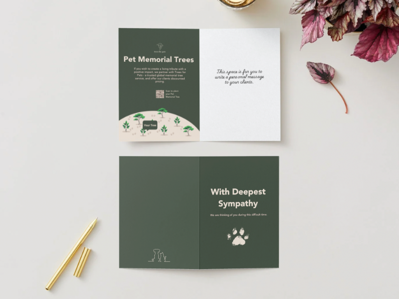 We have designed a beautiful sympathy card with a blank page for your clinic team to write a personal message. The card includes a QR code for your clients to plant a pet memorial tree at a discounted rate. This option is completely free for your clinic.